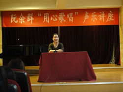音乐学院艺术楼A-308座无虚席。国家一级演员、中央歌剧院歌剧青年女高音歌唱家阮余群正在为音乐学子们做主题为“用心歌唱”的声乐讲座。