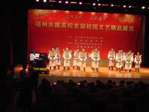 下午,首届校园文艺精品展演拉开帷幕。音乐学院与市属各高校的学生共同表演校园文艺节目。12级30名学生在陆徽老师指挥下,倾情演唱《闽江学子之歌》,展示了闽院学子昂扬进取、蓬勃向上的精神风貌。而10级的男生小组唱《蒙古人》则将蒙古族音乐粗犷、豪迈的风格演绎得淋漓尽致,表现了一定的艺术演唱功力。