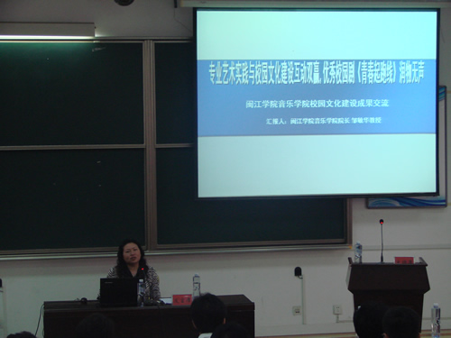 等4所获得省级以上校园文化建设成果奖的学校在会上做了交流。音乐学院院长邹敏华代表学校作了题为《专业艺术实践与校园文化建设互动双赢,优秀校园剧〈青春起跑线〉润物无声》的发言,向到会的市属高校60余名代表汇报了音乐学院近些年参与校园文化建设,编创、演出校园剧《青春起跑线》的经验与体会。