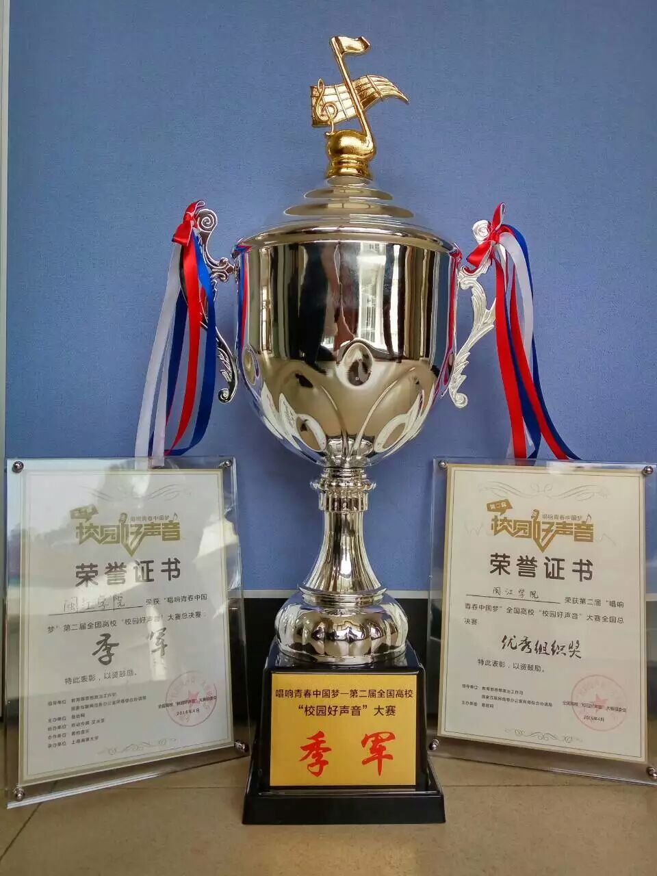 图:全国第二届校园好声音第三名比赛现场、与领导合影及奖状奖杯(20160428)