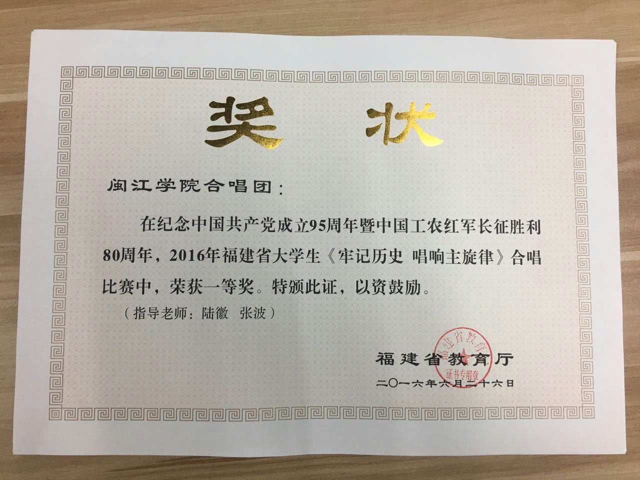 刚刚获悉,2016年6月14日在福建省教育厅(省委教育工委)主办的“庆祝中国共产党成立95周年和中国工农红军长征胜利80周年”2016年福建省大学生《牢记历史唱响主旋律》合唱比赛中,由陆徽老师担任指挥并由 thisav 合唱团演唱的《忆秦娥·娄山关》、《在太行山上》两首作品喜获一等奖。
