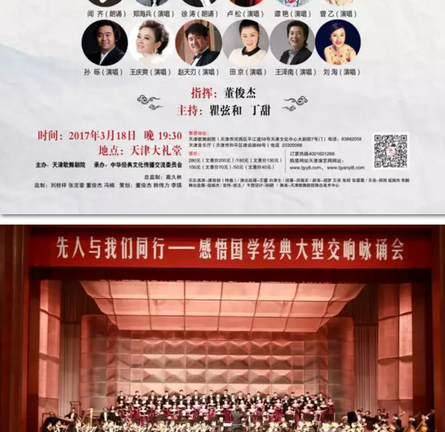 据悉,此次《先人与我们同行》感悟国学经典大型交响咏诵会,是由中国文联主办,天津歌舞剧院和福建省歌舞剧院联袂推出的。今年两会期间,3月7、8日,该作品在京上演。此次天津场为全国巡演的第二场。
