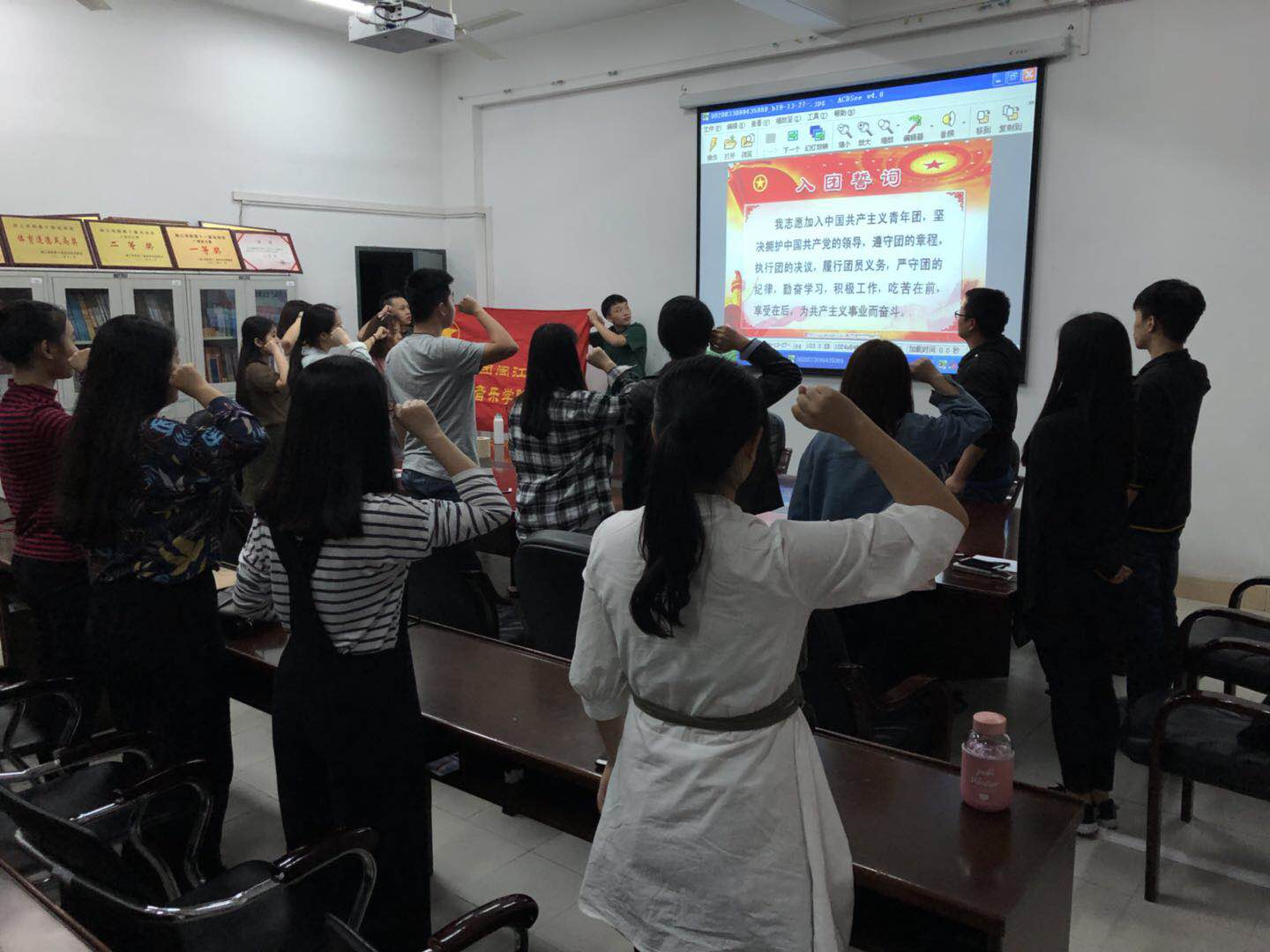 最后,本次座谈会在集体的宣誓中结束, thisav 团委负责人罗强老师带领全体学生干部重温了入团誓词,进一步让全体团学干部牢记团的宗旨,不忘初心,践行青春誓言,做到有担当,有奉献,争做学院团学工作的领跑人、排头兵。