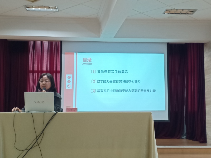 讲座中,许京教授从音乐教育实习的意义、教学能力是教育实习的核心能力、教育实习中影响教育教学提高的因素及对策三个方面向大家做了深入的讲解。许京教授指出音乐教育实习是教师入职前一种重要的培养方法,也是高师音乐教育质量的重要检验标准!作为一名有志于步入教育事业的学生来说,认真对待教育实习至关重要。  讲座上,许京教授还结合自身工作经历,分享了她的工作经历与工作经验,并为我们在校音乐生从事音乐教育提出了两点要求:一是要重视即兴伴奏能力的培养;二是要掌握全面综合的音乐能力,成为一名全能型音乐人才 。