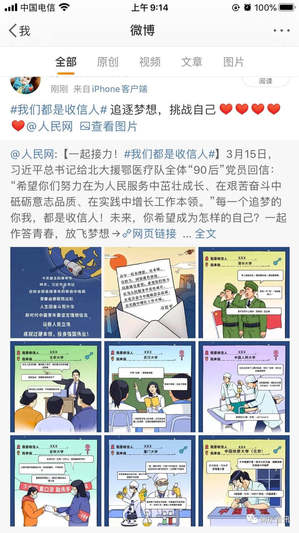 支部全体党员在微信群里共同学习习近平总书记的重要讲话,在微博开展”@大接龙“联学活动,在微信和微博的人民网官微参与评论互动,助力#我们都是收信人#主题活动。