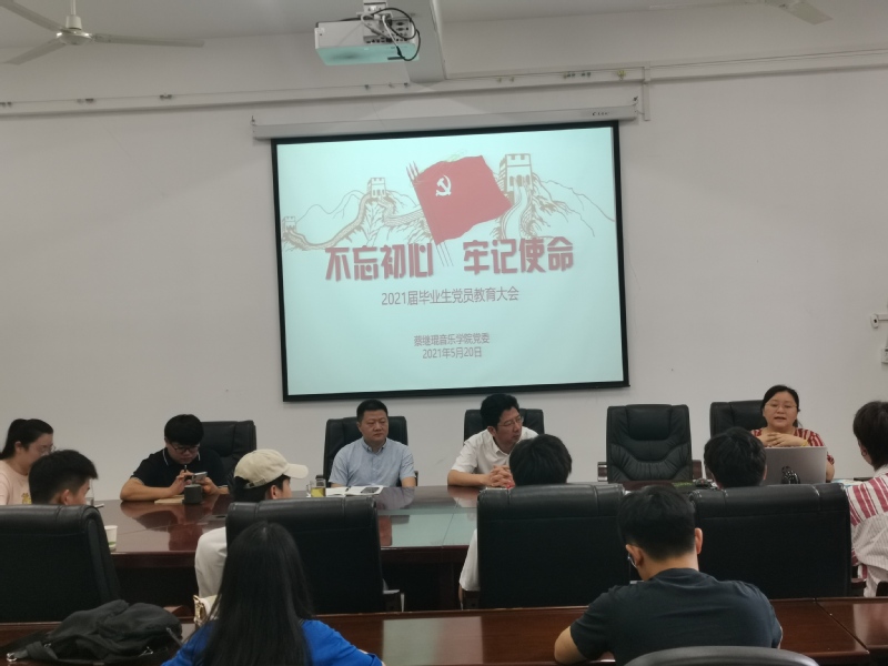 不忘初心、牢记使命5月20日上午,音乐学院党委召集2021届全体毕业生党员开展了题为“不忘初心、牢记使命”的主题教育,学院党委杨小高书记、李友山副书记都参加了会议。