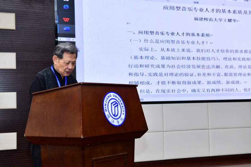 来自福建师范大学博导王耀华教授分享了题为《应用型音乐人才的基本素质及其培养》,概述了应用型音乐人才的基本素质和特点,提出在传承性的基础上吸收外来因素。他强调所有音乐教育从业者要热爱自己所从事的应用型音乐事业,具备一定的音乐理论基础和实践技能,能够克服一切困难,忠于人民音乐事业。