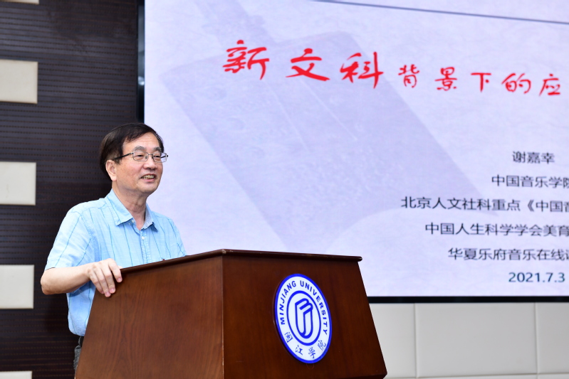 中国音乐学院教授、博导谢嘉幸做了《新文科背景下的应用型音乐人才培养》主旨演讲,指出进入到网络时代,应当瞄准国家需求和市场需求,聚焦核心素养,实现平台共享,培养热衷于公益事业的应用型人才。