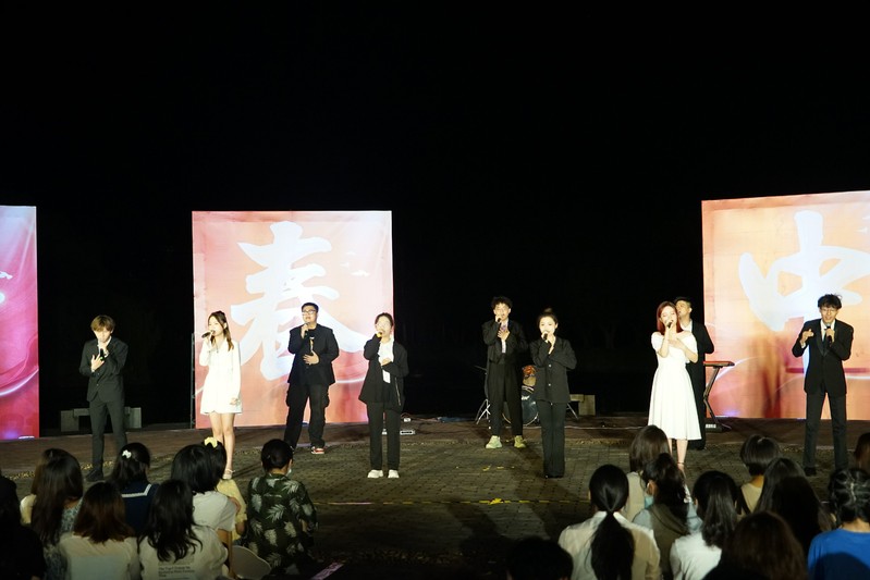 晚会还开展了“红歌接力唱”的游戏环节,场上的同学们随机分为两组比赛进行唱歌,主持人与观众的互动也让全场欢笑连连。游戏的最后,全场观众合唱《龙的传人》现场氛围十分活跃。由音乐学院青年合唱团带来的混声合唱《草坪上围成圈儿跳》,以欢快的节奏与充满趣味的表演形式展现了音乐学院学子充满热情,活力四射的精神面貌。《千山万水》由方文山作曲,周杰伦作曲,该曲为2008年北京奥运会而创作,晚会为致敬东京奥运会为国争光的奥运健儿们,由音乐学院20级的封舜演唱。女生独唱《山外小楼夜听雨》,以古色古香的歌词,仿佛把观众们带到了秋来乍到,细雨绵绵的江南水乡。