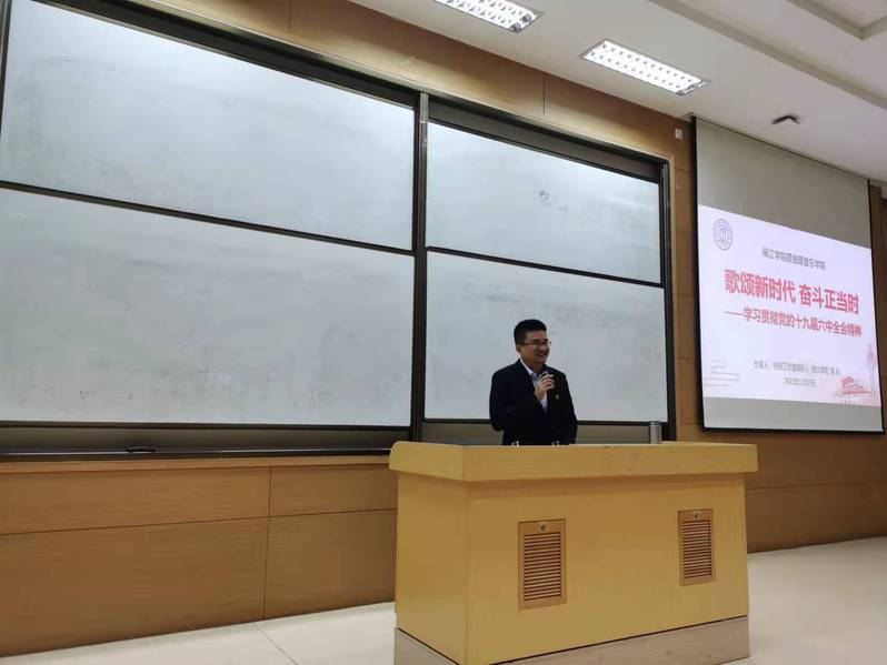 12月3日,蔡 thisav 举行党的十九届六中全会精神宣讲会。 thisav 马克思主义学院副教授、全国模范教师,首届全国高校思政课教学展示特等奖、第五届福建省青年教师教学比赛特等奖、福建省五一劳动奖章获得者,福建省高校优秀思想政治工作者、福州市最美教师陈东开展了“歌颂新时代,奋斗正当时”——学习贯彻党的十九届六中全会精神辅导报告。音乐学院学生代表踊跃报名参加,学院党委副书记李友山主持会议。