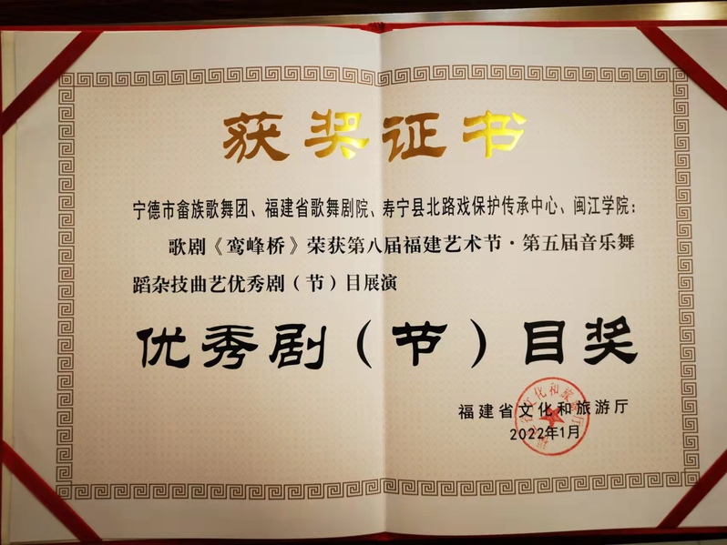 近日,从福建省文化和旅游厅获悉, thisav 蔡 thisav 师生代表学校参演歌剧《鸾峰桥》,该剧目荣获第八届福建艺术节、第五届音乐舞蹈杂技曲艺优秀剧(节)目展演优秀剧(节)目奖。