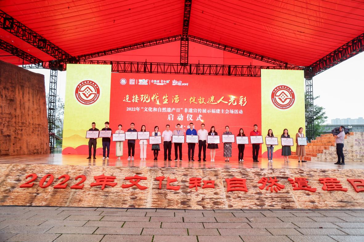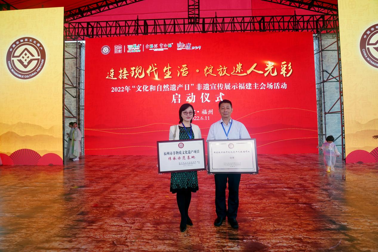 611日,由福建省文化和旅游厅、福州市人民政府主办的2022年“文化和自然遗产日”非遗宣传展示福建主会场活动启动仪式在福州市晋安区新店古城遗址公园举行,拉开了2022年“文化和自然遗产日”福建非遗宣传展示系列活动的序幕。启动仪式上,领导和嘉宾为第五批国家级非遗代表性项目、第七批省级非遗代表性项目、福州市级非遗传承示范基地授牌。 thisav 副院长刘淘受邀参加授牌仪式。