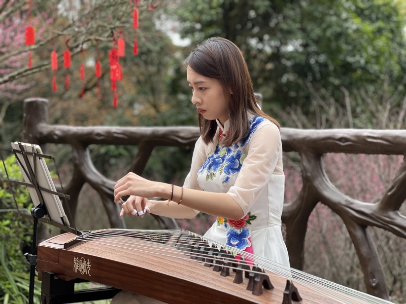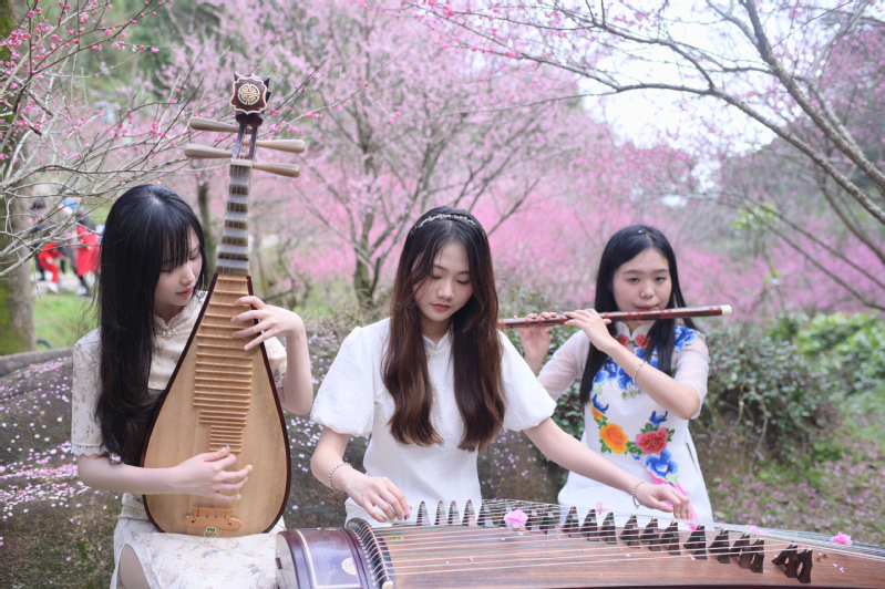 由音乐学院的张婧琪、陈林娟、林心琬、欧阳一心和邵雯组成的乐器表演小分队,分别在景区入口、相怀梅园、古泉跌水、岩梅古台四处设点,为游客带来了扬琴、古筝、琵琶和竹笛演奏,为游客们带来了《兰亭序》、《清明雨上》、《春到湘江》、《海峡音诗》等古典曲目的演奏。琴声、笛声悠长,与山间鸟鸣遥相应和,合奏着林间交响曲,吸引了众多游客一一驻足停留欣赏并纷纷拿出手机拍照、录像、合影。