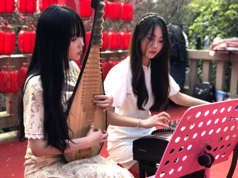 由音乐学院的张婧琪、陈林娟、林心琬、欧阳一心和邵雯组成的乐器表演小分队,分别在景区入口、相怀梅园、古泉跌水、岩梅古台四处设点,为游客带来了扬琴、古筝、琵琶和竹笛演奏,为游客们带来了《兰亭序》、《清明雨上》、《春到湘江》、《海峡音诗》等古典曲目的演奏。琴声、笛声悠长,与山间鸟鸣遥相应和,合奏着林间交响曲,吸引了众多游客一一驻足停留欣赏并纷纷拿出手机拍照、录像、合影。