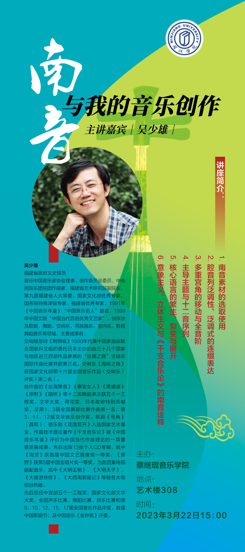 吴少雄,福建省政府文史馆员。曾任中国音乐家协会理事、创作委员会委员、中央民族乐团驻团作曲家、福建省艺术研究院副院长、第九届福建省人民代表大会常务委员会委员。国家文化部优秀专家、国务院特殊津贴专家、福建省优秀专家。1991年《中国音乐年鉴》“中国音乐名人”提名,1999年中国文联“中国当代百名优秀文艺家”。创作涉及歌剧、舞剧、交响乐、民族器乐、室内乐、影视舞蹈音乐等领域,主要成果有: