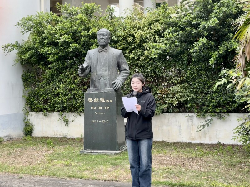 2022级胡湘楠同学代表全体同学向蔡继琨教授致以深切的怀念与感恩。她表示日月既往,不可复追。如今,身为蔡 thisav 学子,更应该传承蔡继琨教授爱国爱乡的情怀、严谨治学的精神,将自己的所学知识技能服务社会、服务人民。