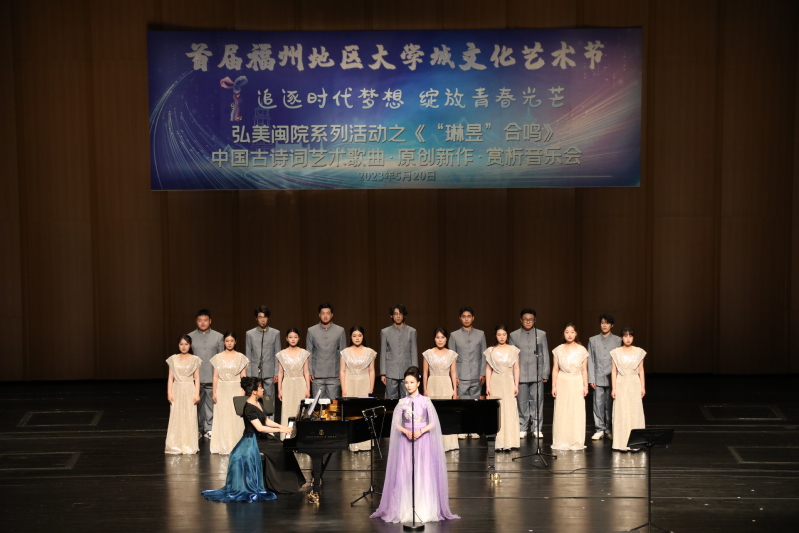 5月20日晚, thisav “弘美闽院”系列活动之“琳昱”合鸣中国古诗词艺术歌曲赏析音乐会在福州地区大学城文化艺术中心保利剧院上演,该音乐会演出团队由 thisav 蔡 thisav 师生与中国音乐学院声歌系女高音歌唱家李琳老师、青年合作钢琴家刘瑾昱老师共同组成。张建安副校长、宣传部任涛部长出席, thisav 师生代表及社会观众近千人共同欣赏了本次音乐会。音乐会由蔡 thisav 2022级学生王欣瑞主持。