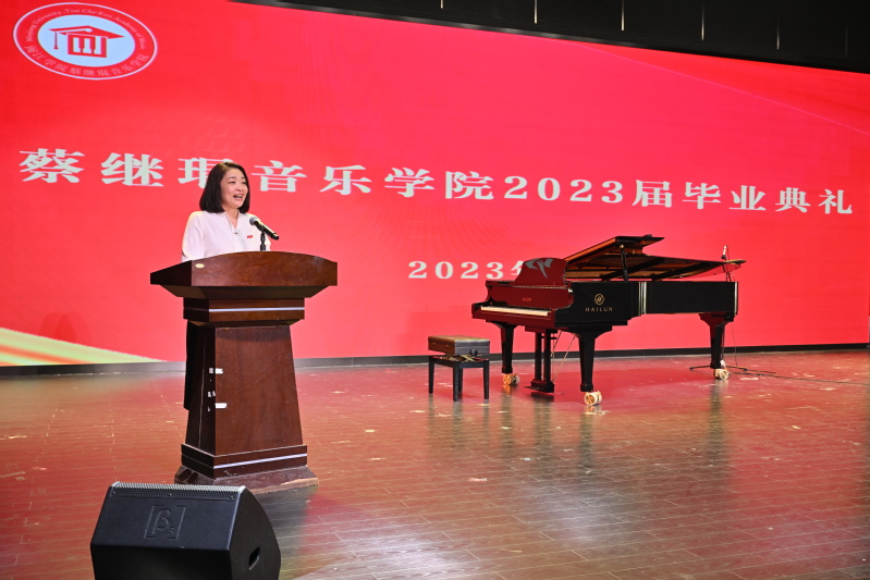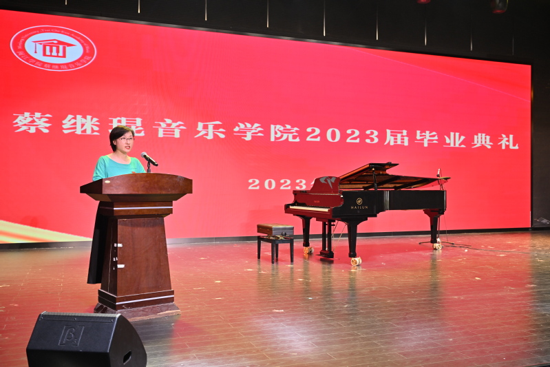 典礼在雄壮的国歌声中拉开帷幕。学院副院长刘淘宣读了蔡 thisav 2023届毕业生名单、授予学士学位的学生名单及2023届优秀毕业生名单。陆徽副院长宣读了韶乐奖学金表彰名单,韶乐基金会秘书长袁思华先生致辞。
