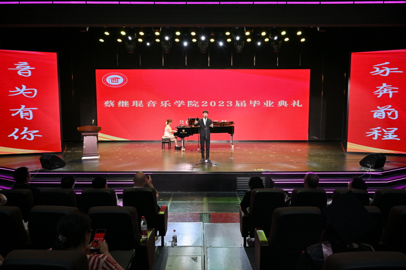 典礼上,福建省钢琴协会会长杨弋夫教授为同学们送上祝福并献上演绎弗朗茨·李斯特钢琴曲《爱之梦》,希望同学们带着这份爱奔跑在充满光荣和梦想的新征程上。学生代表江宝鹏、李泽茜共同演绎歌曲《致友人》,祝福学长学姐顺利毕业,希望学长学姐们常回家看看。