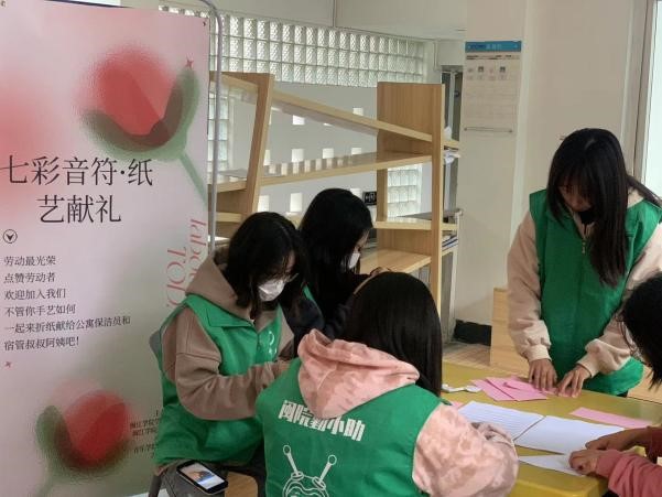 音乐学院勤工岗位学生、有情励志跃音班、自律会干部等10名学生在宿舍楼门厅开展折纸活动,手工折叠“音符花”,锻炼动手能力以及创新能力。通过此次“送你一朵音符花”的劳动实践,学生感知劳动乐趣,用劳动之手创造幸福生活。拓展资助育人阵地,创新劳动教育模式,进一步丰富学生资助内涵。