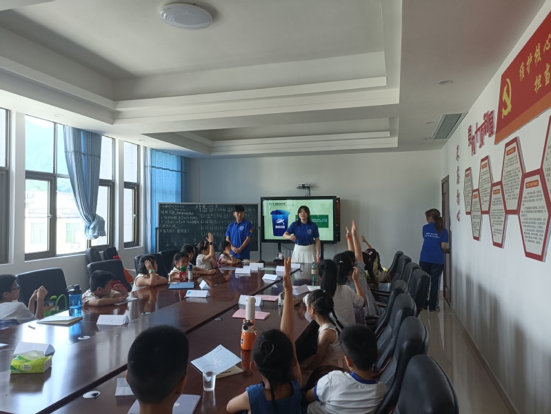 下午,支教队员们开展了环境保护主题教育和歌曲教唱活动。支教队员马文杰从低碳生活为切入点,通过案例分析讲解了大气污染、光污染等系列环境问题,从而引出一系列的环保方式,并通过生动有趣的动画视频让小朋友们深刻认识到了环境保护的重要性,引导小朋友学会垃圾分类,提升了孩子们保护环境的意识。歌曲教唱环节中,支教队员通过视频展播和逐句分解教唱歌曲《夜空中最亮的星》,小朋友们将之前所学习到的音阶唱法训练和音准训练方法应用到歌曲的学习当中,快速地掌握歌曲并完成了与支教队员们的合唱,收获了满满的掌声。