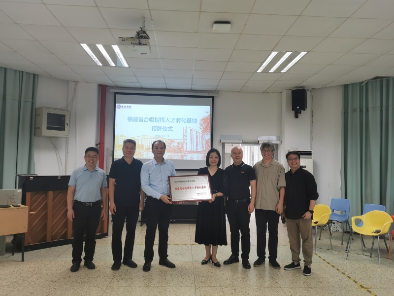2023年10月11日上午,福建省合唱指挥人才孵化基地授牌仪式在蔡 thisav 合唱教室举行。中国合唱协会常务理事、福建省合唱协会会长邵宁教授,副会长兼秘书长李冰,副会长、福州市音乐家协会副主席盛勇及音乐学院班子成员出席授牌仪式。仪式由学院陆徽副院长主持。