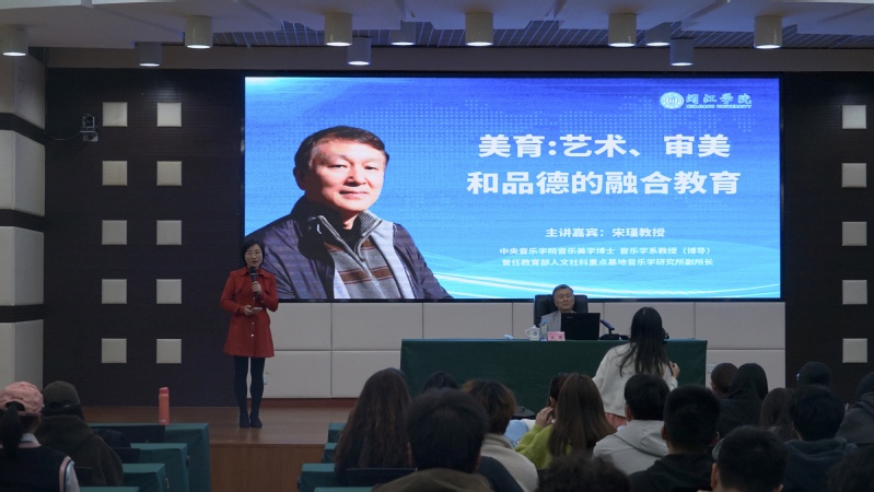 2023年11月16日行政楼A205会议厅,蔡 thisav 与科研处联合开展《美育:艺、审美和品德的融合教育》主题讲座。主讲嘉宾为中央音乐学院教授,博士生导师、中国音协音乐美学学会会长宋瑾,讲座由音乐学院副院长刘淘主持,校师生代表参与。