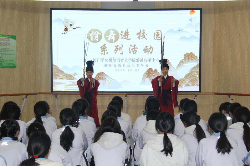 128日下午,在福州文教职业中专学校, thisav 佾舞传承中心的5名佾生,以浓厚的文化底蕴和庄严肃穆的表演开启了《佾舞进校园》系列活动。此活动旨在传承非物质文化遗产——佾舞,活动吸引了国家级非物质文化遗产传承人李宗霖先生、福州文教职业中专学校23级音乐班班主任林莉老师,以及正在福州文教职业中专学校开展毕业实习的2020级音乐学(师范)班的同学等嘉宾。佾生们与23级音乐班的同学们展开了交流互动,共同分享非遗文化的力量和魅力,现场氛围温馨而热烈。
