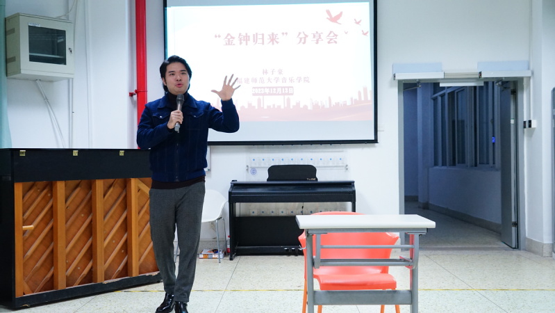 为深入推进书香闽院建设,提升学院师生专业水平,培养应用型人才,20231213日,蔡 thisav 于融侨合唱教室举行“金钟归来”分享会,讲座特邀第十四届中国音乐金钟奖声乐(美声)比赛总决赛第一名获得者、福建师范大学青年教师林子豪主讲,学院声乐教研室相关老师和学生代表共同参加。讲座由学院副院长刘淘主持。