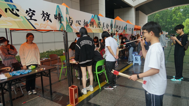 在此次活动中,音乐学院精心准备了一系列特色活动,包括“音疗愈心”音乐表演活动、“让我听你说”心语树洞述说活动和投壶拆盲盒活动,受到现场同学们的欢迎。