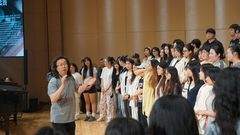 讲座中,叶荣老师就“合唱”两个字进行深入浅出地讲解,强调合唱的精髓在于“合”。并分享了如何运用听觉感受音乐、如何合理调整咬字方式进行演唱等方面的经验。随后,叶荣老师带领同学们排练曲目《启程》,针对同学们存在的问题进行指导。