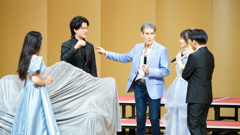 在大师课的最后阶段,陈乃嘉、郑林舒婕和张波三位老师联同音乐学院歌剧团的同学们精彩呈现了著名歌剧《茶花女》的唱段《饮酒歌》。为了加深演员们对角色的理解和表现,大卫·沃尔什导演亲自示范如何通过动作和表情来生动地描绘不同角色的独特性格,他特别强调了要利用道具和舞台布局营造酒会微醺的氛围,加强观众的沉浸感。