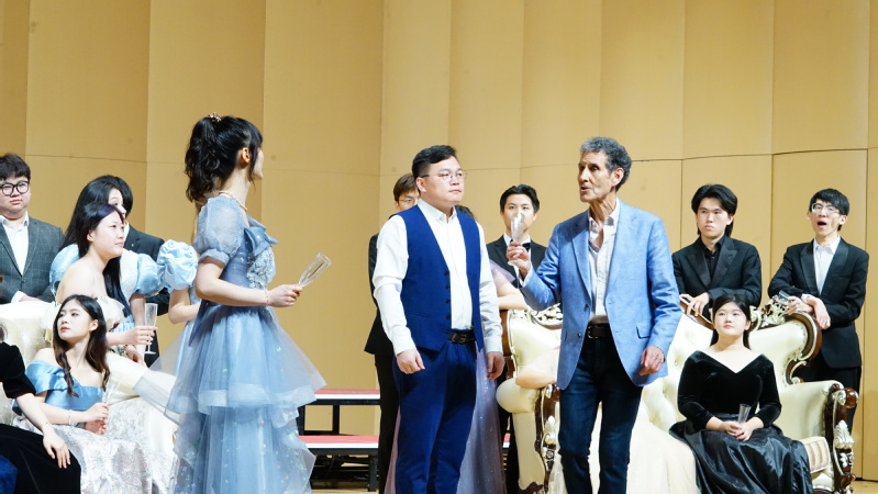 在大师课的最后阶段,陈乃嘉、郑林舒婕和张波三位老师联同音乐学院歌剧团的同学们精彩呈现了著名歌剧《茶花女》的唱段《饮酒歌》。为了加深演员们对角色的理解和表现,大卫·沃尔什导演亲自示范如何通过动作和表情来生动地描绘不同角色的独特性格,他特别强调了要利用道具和舞台布局营造酒会微醺的氛围,加强观众的沉浸感。