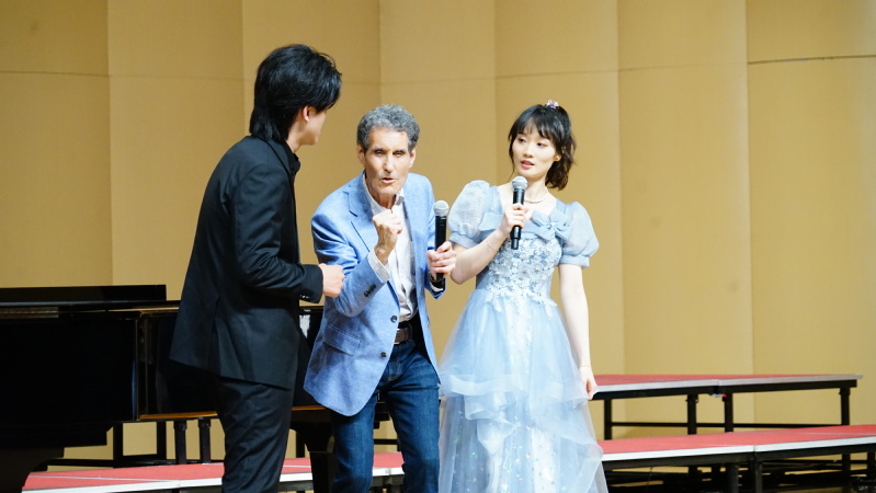 音乐学院2020级江宝鹏同学带来了歌剧《爱的甘醇》中的唱段《像那潇洒的帕里第》,2021级黄昊天同学呈现了来自歌剧《塞维利亚理发师》中的选段《造谣,诽谤》。大卫·沃尔什导演对两位同学的精彩演绎予以了高度的评价,并强调在演出过程中,要分更深入地理解和贴近角色,通过更加细腻的表情和富有表现力的动作来带动歌曲的演绎,更加丰富和深入地诠释歌剧内涵。