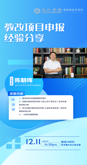 近日,为推动 thisav 教育教学改革的深入发展,提升学院教师的教研能力,特邀请福州大学经济与管理学院副教授,企业经济活动国家级虚拟仿真实验教学中心(福州大学)副主任陈朝晖为 thisav 全体专任教师带来《教改项目申报经验分享》讲座。