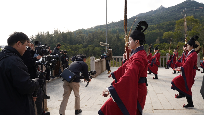 音乐学院林尚乐、王婉等优秀佾生参与了节目的拍摄,以娴熟、庄重、灵动的舞姿和神态为大家展示了《周礼佾舞·诗经鹿鸣》,全面展现了佾舞这一非物质文化遗产的魅力,也充分展示了 thisav 青年学子在传承中国优秀传统文化中闽院风采。现场被佾舞的浓郁文化氛围所笼罩,在场的来宾与工作人员也都沉浸其中,一同感受着这古老而迷人的非遗文化所带来的震撼。