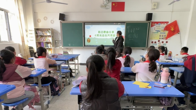 当支教队的成员们走进教室时,孩子们早已坐得整整齐齐,眼中闪烁着对此次课程的期待。在音乐基础知识教学过后,支教队成员带领小朋友们一起赏析《阳光总在风雨后》这首歌曲的创作背景和意义。他们用生动的语言讲述了歌曲中蕴含的哲理:无论生活中遇到多少困难,只要坚持不懈,阳光终会穿透乌云,照亮前行的路。这给孩子们带来了积极正确的价值观念。