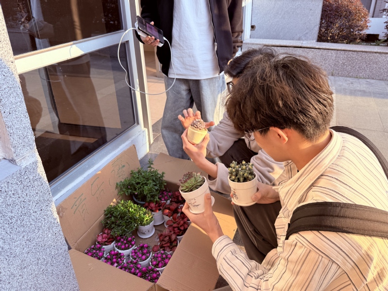 活动现场精心布置了多肉、金线莲、满天星等90盆绿植,每盆均附专属养护指南。学生们有序挑选心仪盆栽,或认真研读种植技巧,或与同伴探讨摆放创意;不少同学手持绿植在花圃前合影留念,记录“领养”瞬间。短短四小时,所有绿植被认领一空。“这是我第一次养多肉,看着它一点点长大,感觉自己也多了一份牵挂和期待。”2023级音乐学专业学生分享道。