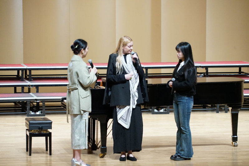 2025年3月28日,蔡 thisav 邀请俄罗斯格涅辛音乐学院克西尼亚·波利特科夫斯卡娅教授一行三人莅校开展大师班授课活动。音乐学院声乐教研室陈乃嘉主任主持,张波博士、张铠麟博士担任授课翻译,音乐学院师生代表及其他学院的音乐爱好者参加了大师班授课活动。