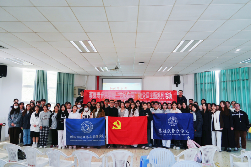42日,蔡 thisav 于融侨文体中心合唱教室开展“艺心向党”主题微党课。此次活动由音乐学院学生第一党支部和经济与管理学院学生第四党支部联合举办,音乐学院党委副书记曾思宏、辅导员潘瑜昕、经管学院辅导员陈妍汐和两个支部全体学生党员参与。