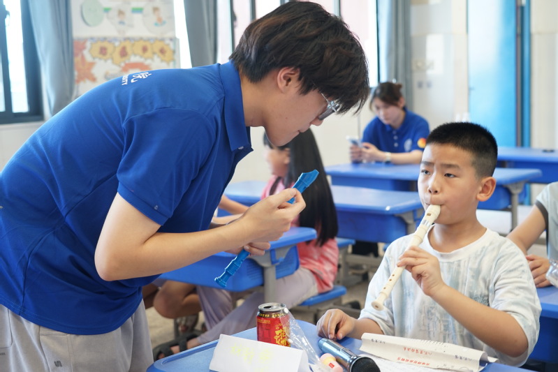 万赛煜、徐承佑开展竖笛教学,从持笛姿势、指法入门到简单乐曲演奏,循序渐进地引导孩子们探索乐器奥秘。孩子们手持竖笛演奏,在旋律的共鸣中感受乐器演奏的乐趣,激发对器乐学习的兴趣。