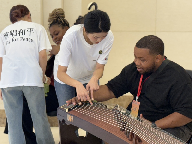 在活动现场,两国青年学子还进行了友好、开心的互动。民乐团的队员热情地为美国青年介绍了中国民族乐器基本知识并指导他们进行尝试、感受中国民族乐器的魅力。