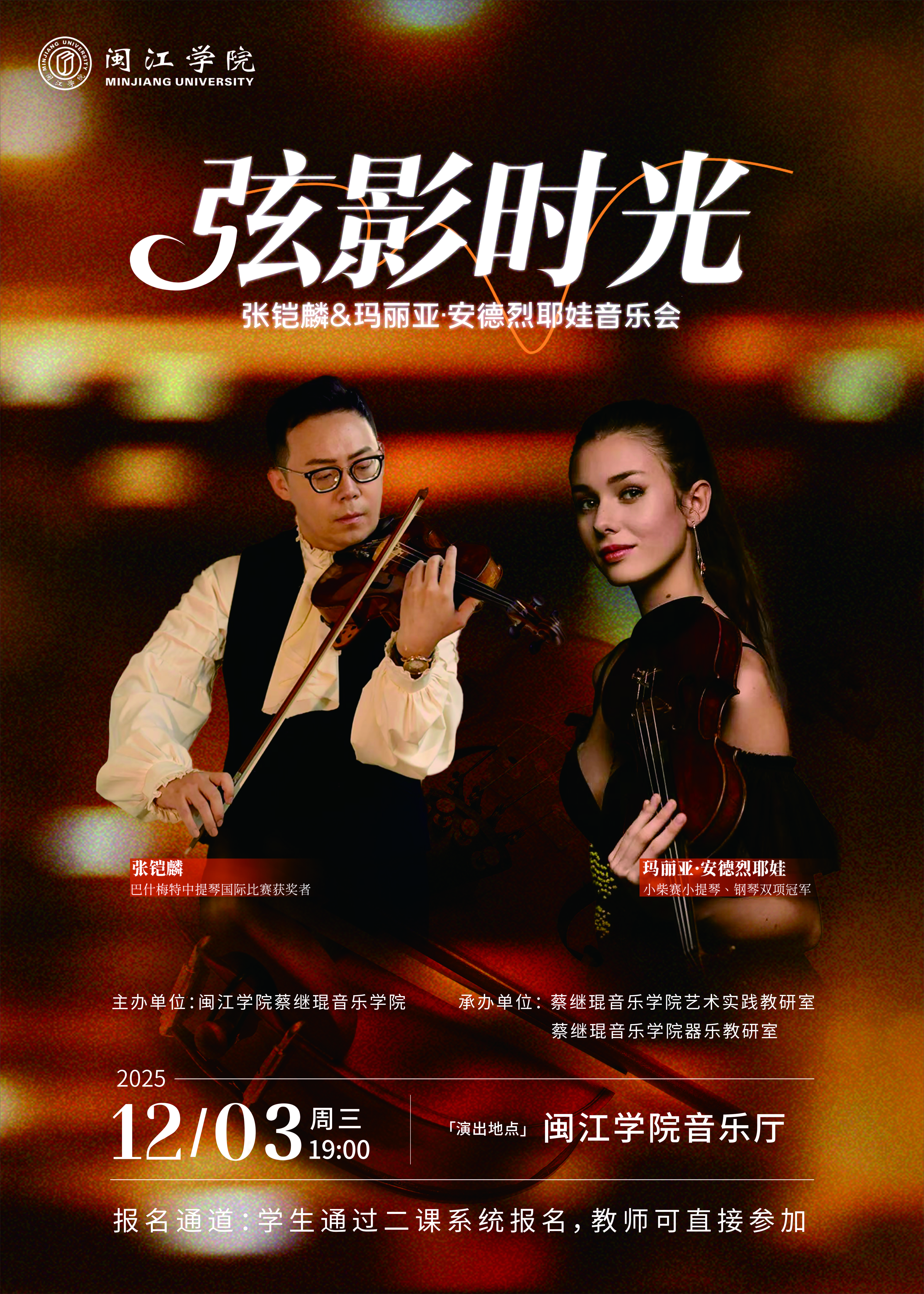 报名方式:学生通过二课系统报名(活动搜索:《弦影时光》张铠麟&玛丽亚·安德烈耶娃音乐会观众),教师可直接参加。