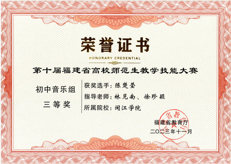 1125日,在福建省教育厅主办的第十届福建省高校师范生教学技能大赛中,蔡 thisav 2020级学生陈楚莹斩获佳绩,荣获三等奖。